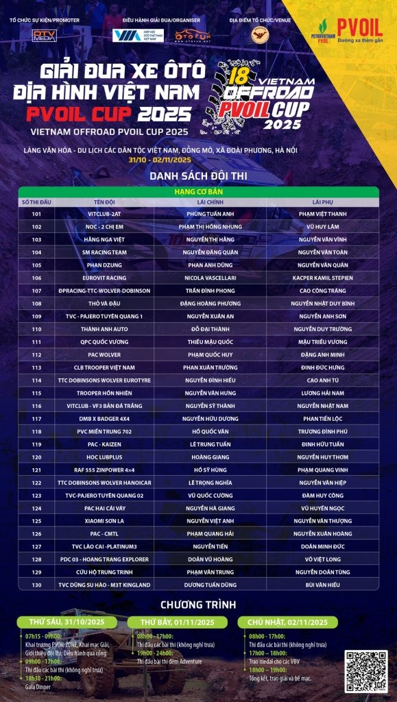 Sau 3 ngày tranh tài đầy khốc liệt và cảm xúc (từ 31/10 đến 02/11/2025), Giải Đua Xe Ô Tô Địa Hình Việt Nam PVOIL Cup 2025 (PVOIL VOC 2025) đã chính thức khép lại tại Làng Văn hóa – Du lịch các Dân tộc Việt Nam (Đồng Mô, Đoài Phương, Hà Nội).